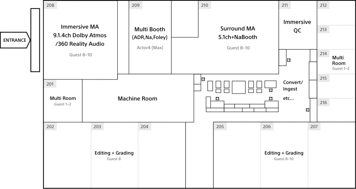 Core編集・グレーディング、イマーシブサウンド、QCスタジオがあり、テクノロジー開発も行う、コンテンツクリエイション拠点