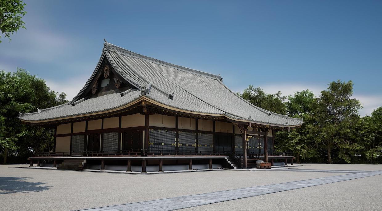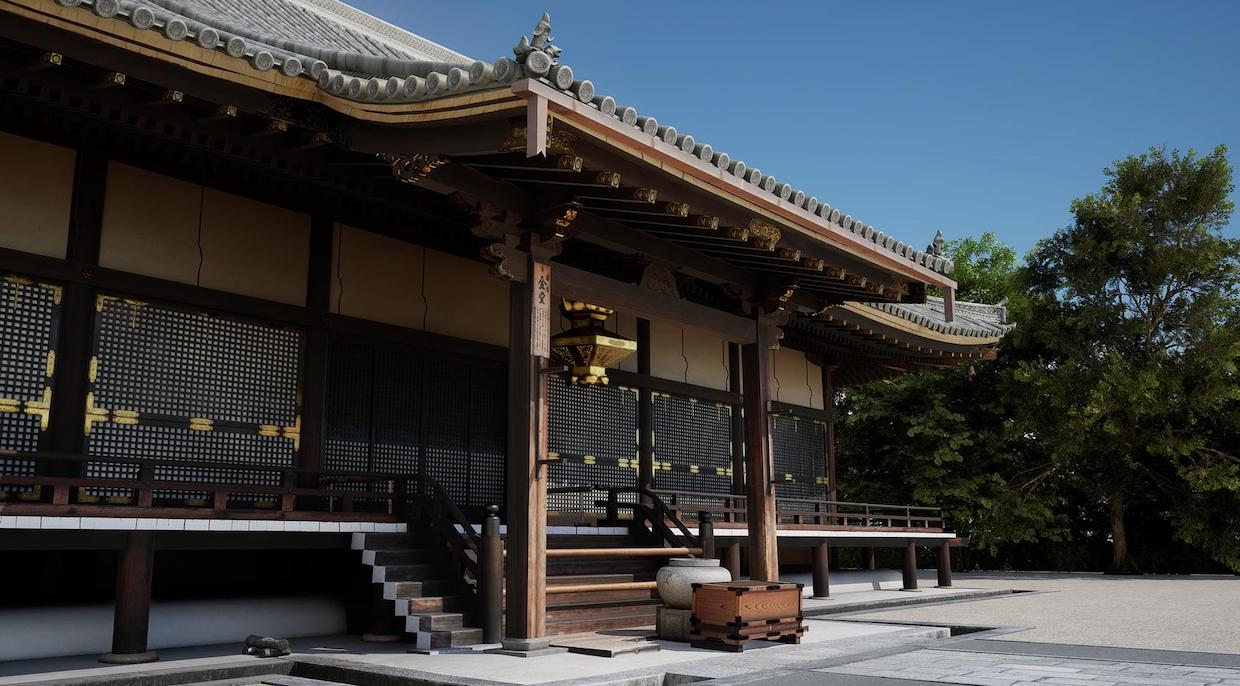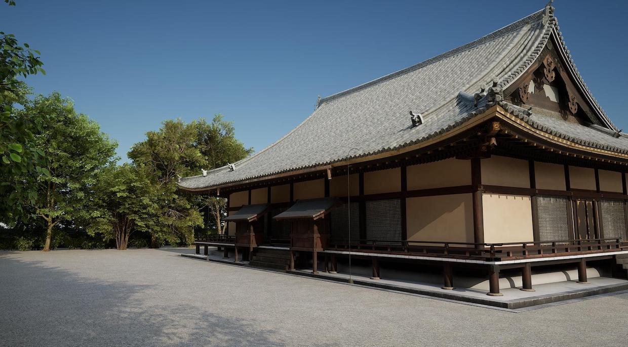 慶長年間(1596~1615年)に造営された日本に現存する最古の紫宸殿(ししんでん、内裏の正殿)である仁和寺「金堂」を、宮殿建築ならではの細部の装飾や、時を経た外壁の木質など、文化財が持つ美しさや歴史的価値を精密に作成しています。