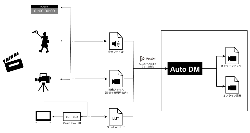 タイムコードをもとに映像・音声ファイルの一本化、オンラインファイル生成、オフライン用プロキシファイル生成、LUT焼込などを行うことで、従来、撮影後に手作業で行っていたシーンごとの収録データ整理を自動化し、撮影から編集工程における素材管理の効率化を実現している。