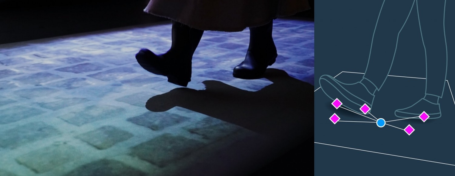 Haptic Floorにインタラクティブ性をもたせ、床が水たまりや砂浜に変わったかのように感じさせる技術。人の歩行にあわせて多彩な振動フィードバックを実現するために、数少ないセンサーで微細な踏み込みの変化を検知する技術が搭載されており、空間を超越したような体験が可能となっている。