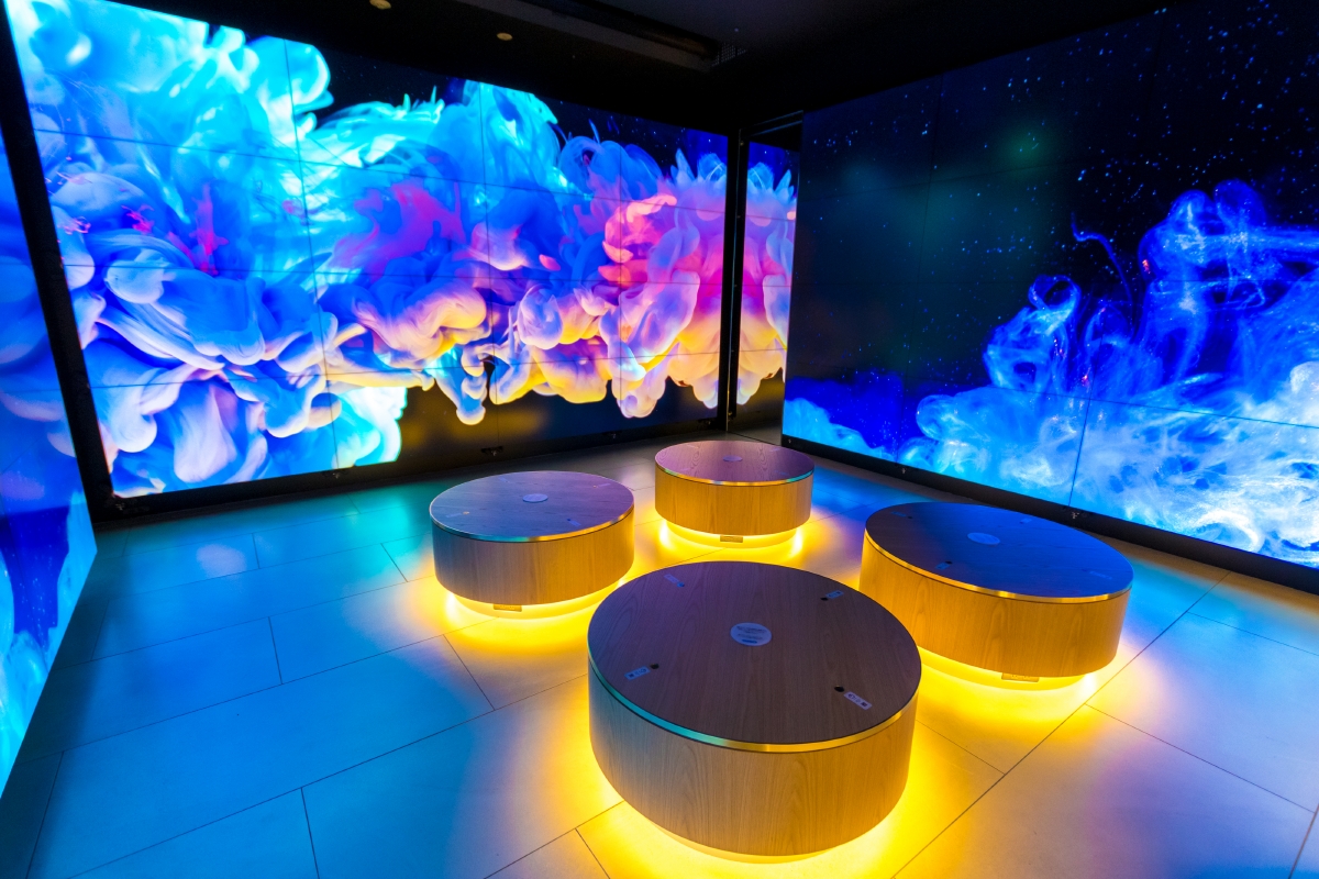 GMOインターネットグループが運営する「GMOデジタル・ハチ公」は、無料で利用できるWi-Fiや充電スポットを備えた、天候に左右されることなく利用できる、渋谷の新たな待ち合わせスポット。最先端のホログラムディスプレイ技術を用いた“デジタル・ハチ公”をはじめ、ソニーの空間音響技術である「Sonic Surf VR(SSVR)」による立体的なサウンドや、220インチのディスプレイで構成される三面の壁に映し出される高精細映像により、これまでにない没入感を体験できるデジタルアート空間となっている。