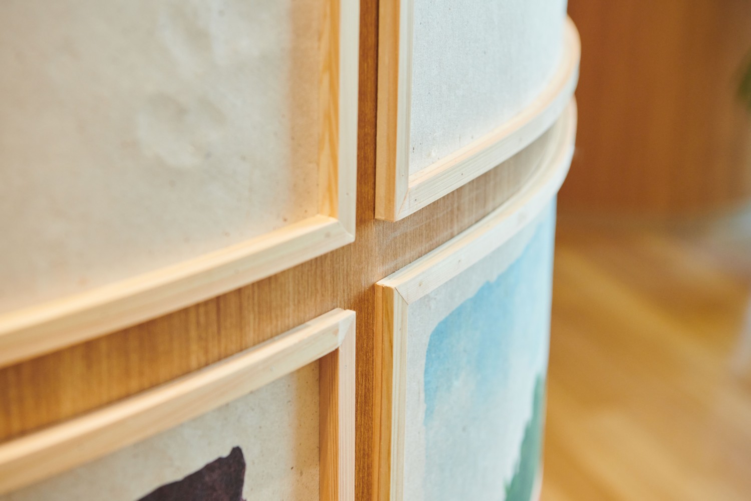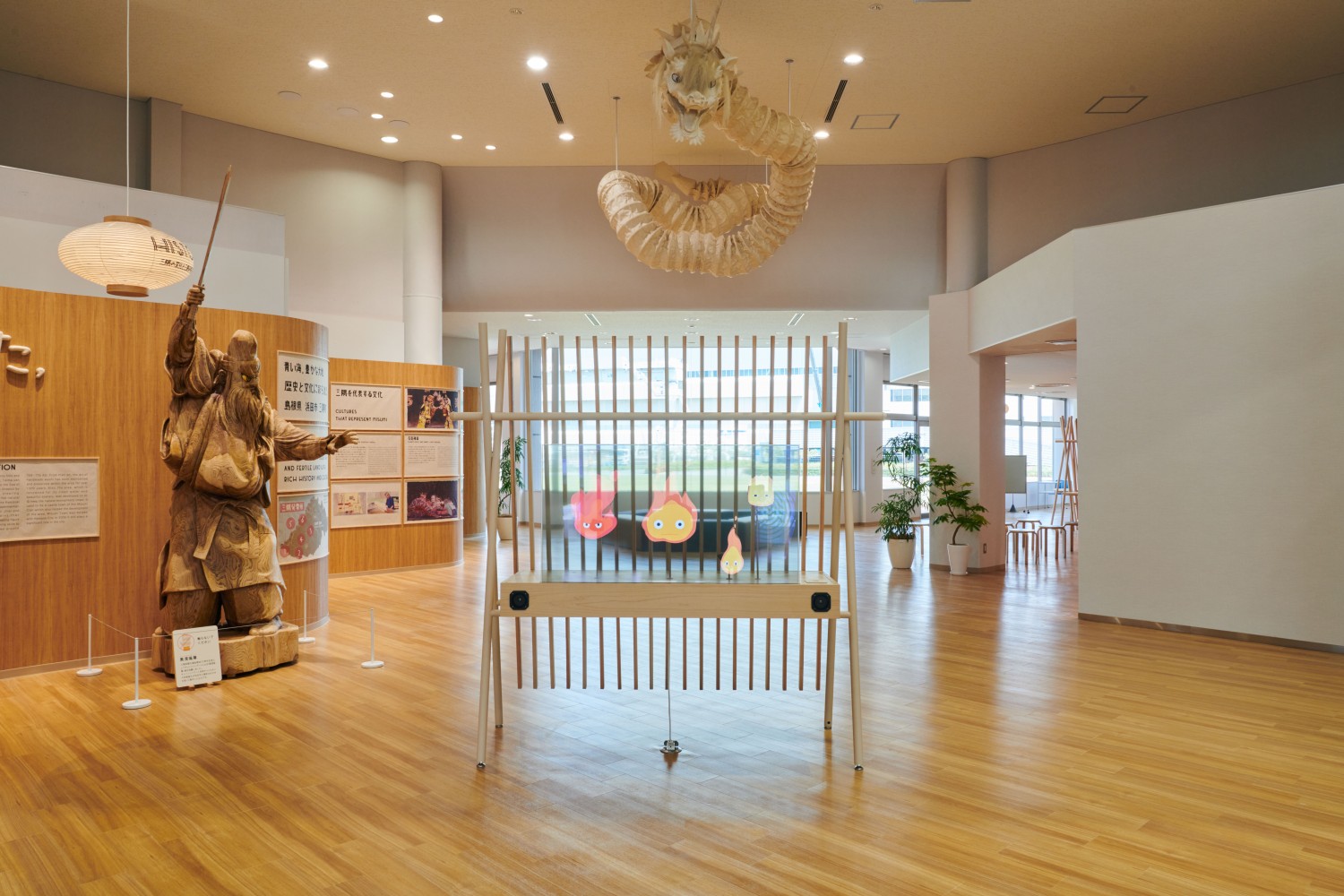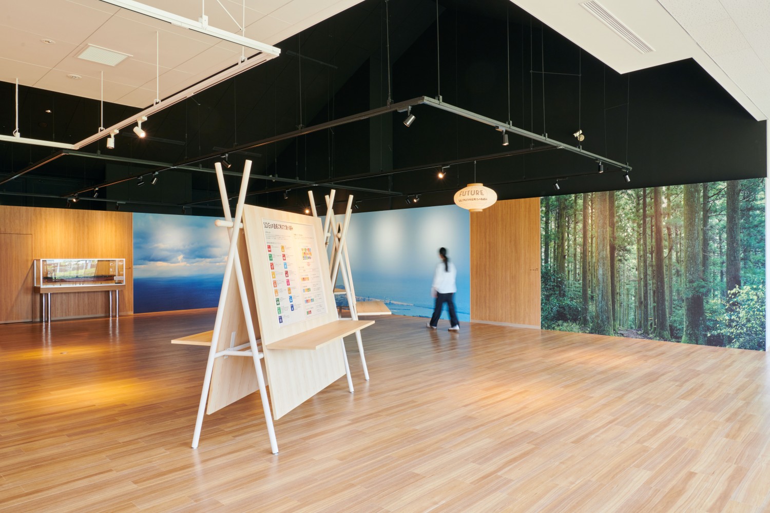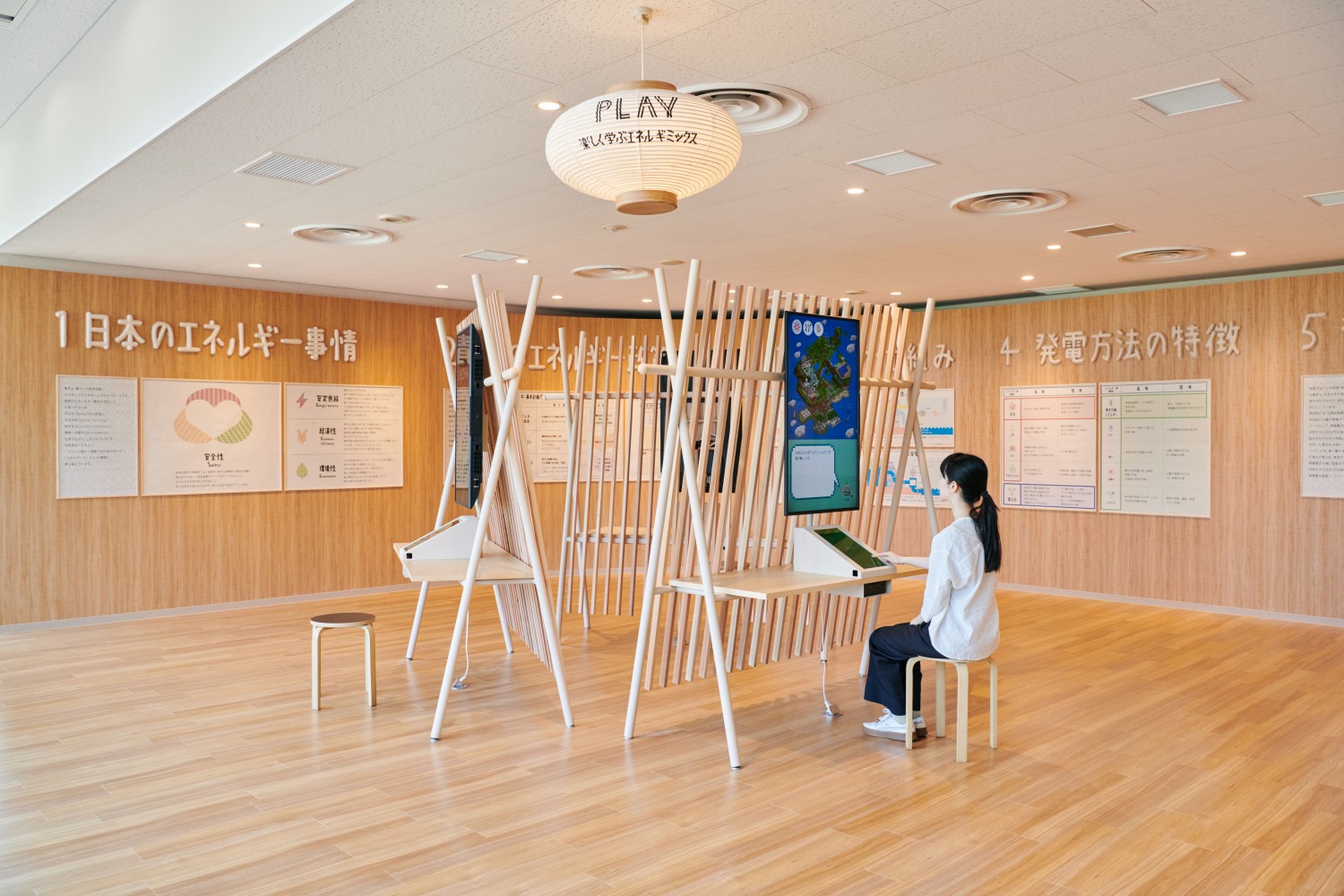 三隅発電所が位置する島根県浜田市三隅町は自然豊かな環境にあることから、内装全体をやわらかい木のトーンで設計。モニターやゲームコンテンツの什器は、三隅町の観光スポットでもある室屋の棚田に広がる「稲架」の風景から形状をデザインした。また、各展示ではユネスコ無形文化遺産にも登録をされている島根のローカルクラフトである「石州和紙」を使用し、立体文字の制作や、石州和紙に対して直接印刷するなど、三隅町の施設ならではのマテリアルを採用。地域に根差し、地域のために日々企業活動する中国電力や三隅発電所の姿勢を体現するコミュニケーションデザインを開発した。