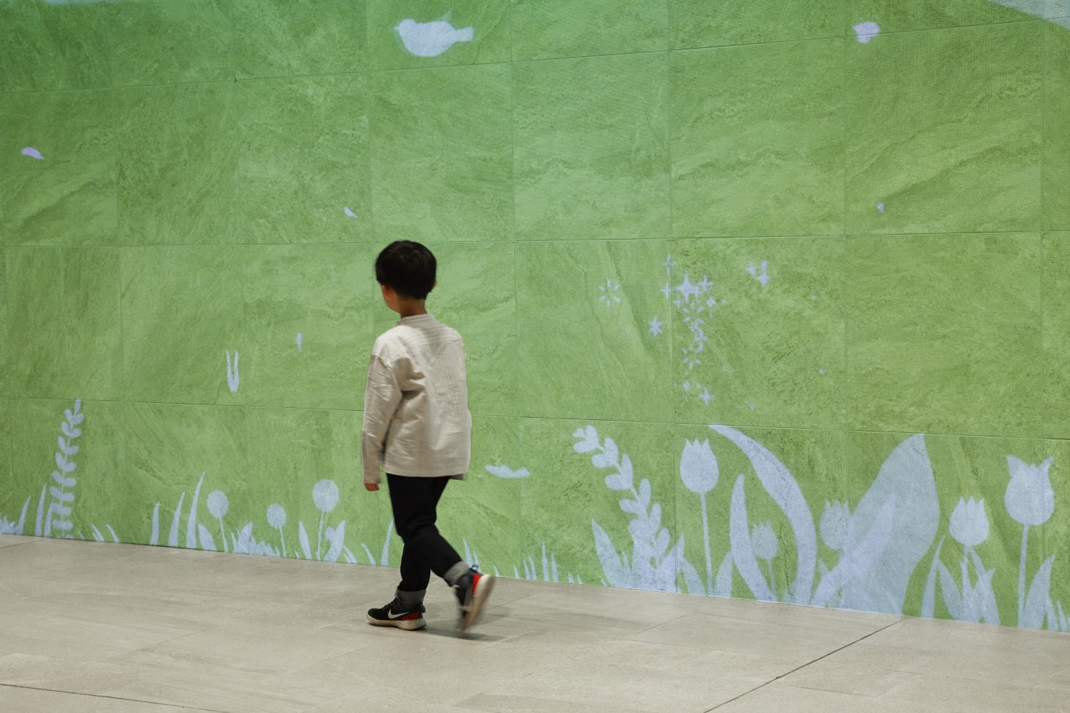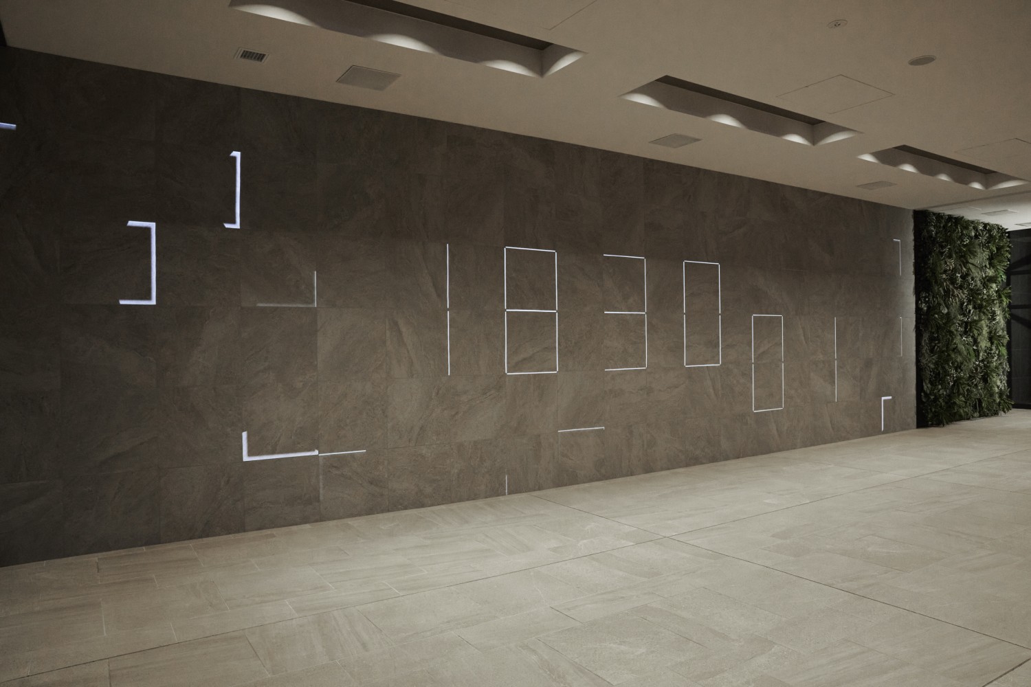 ワイドな壁面スクリーンに表示するコンテンツは、バックエンドで、時刻、天気、季節などの情報をプログラム上に取り込み、その時に合ったビジュアルデザインを反映。